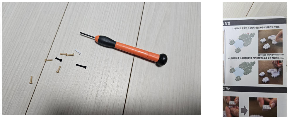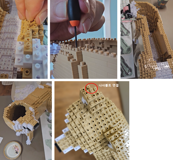 블록은 작고, 나사볼트도 정말 많이 사용되고, 하나 낄때마다 드라이버로 고정시키고, 동물제품 특성 상 동일색상 블록이