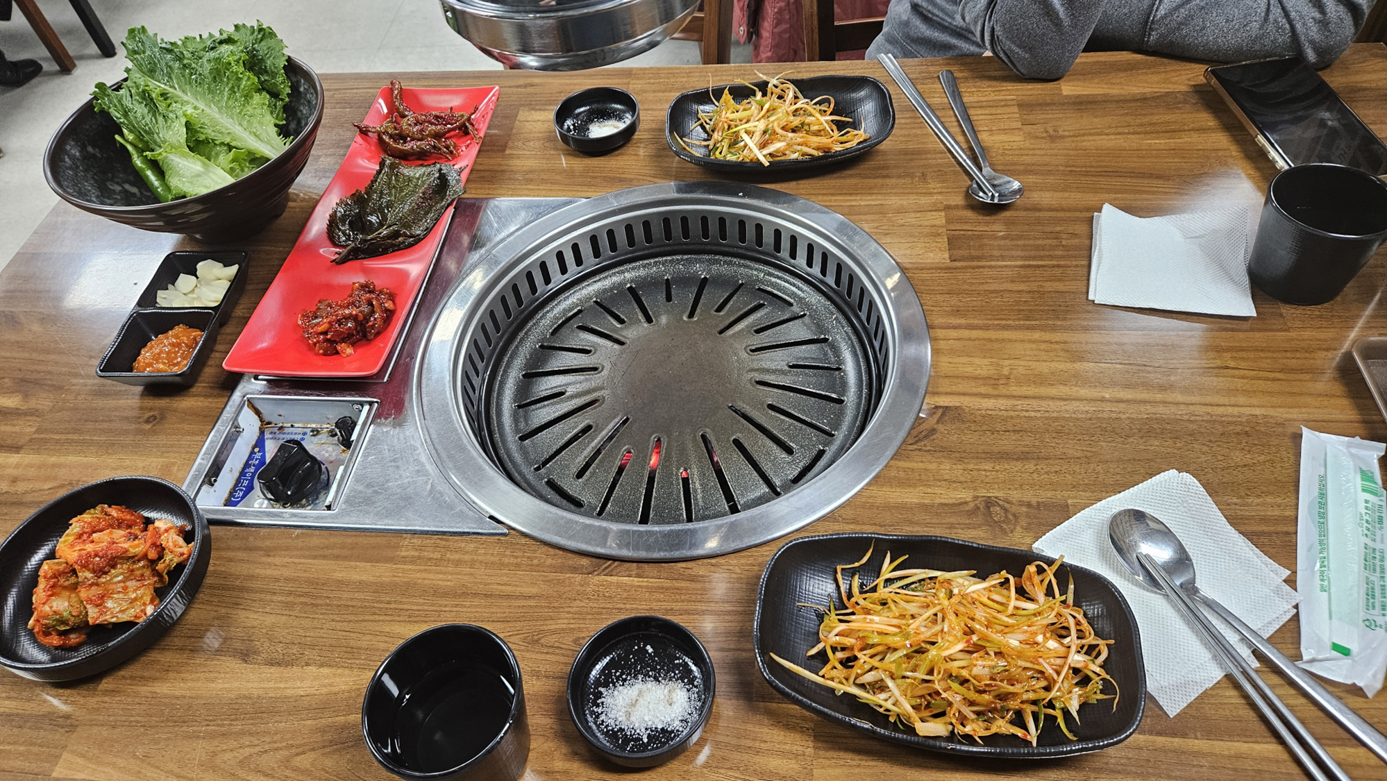 주문 후 기다리면 즉석에서 바로 무친 파채와 간단한 밑반찬들을 가져다 주시고 숯불을 넣어주세요.