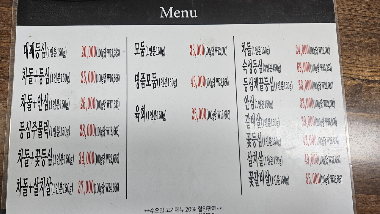 수요일은 여기서 20%할인이 들어가니 그나마 좀 맘이 편하더라구요 (식사, 음료 등 고기 외 메뉴는 할인 제외)